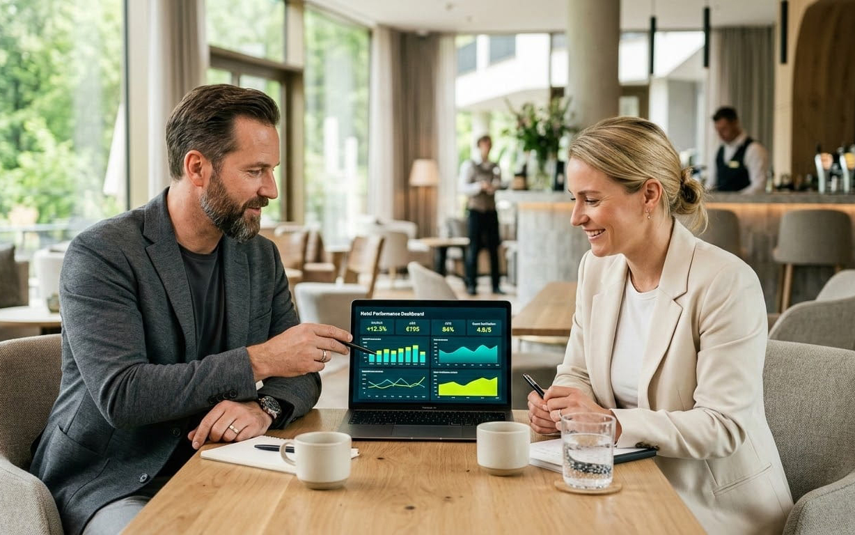 Die Umsatzsteigerung wird durch eine gemeinsame Analyse von Kennzahlen, Preisstrategien, Marketingaktivitäten und internen Abläufen erreicht. Daraus werden konkrete Maßnahmen abgeleitet, die zu besseren Preisen, mehr Buchungen und effizienteren Prozessen führen, um die Profitabilität nachhaltig zu verbessern.